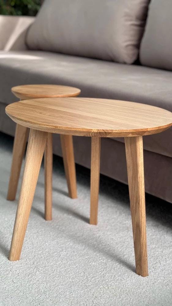Zwei runde Beistelltische aus massivem Eichenholz – zeitloses Design und handgefertigt. Stabil, langlebig und vielseitig einsetzbar als Couchtisch, Kaffeetisch oder Ablage im Wohnzimmer, Schlafzimmer oder Büro.
